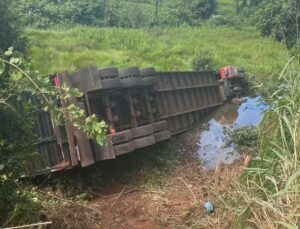 caminhão com carroceria tipo gaiola tombou logo após o rio Javari, a